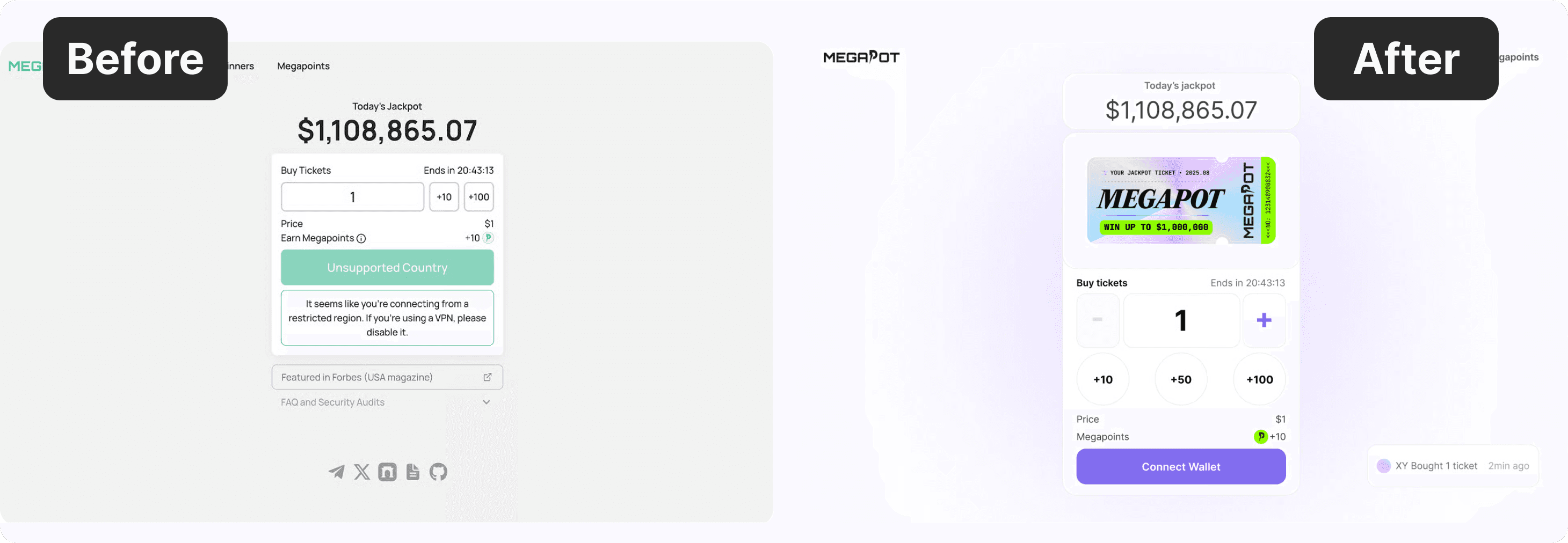 After: The redesigned version reframes the entire experience by introducing structure, depth, and emotional cues before asking for action. The jackpot is now placed inside a soft container, which immediately makes it feel official, stable, and intentional. This framing signals importance and legitimacy, helping users anchor their attention. Below it, the ticket graphic acts as a strong visual metaphor—it translates an abstract digital transaction into something familiar and tangible. Users no longer need to intellectually process what they’re doing; they intuitively understand that they are “buying a ticket.”