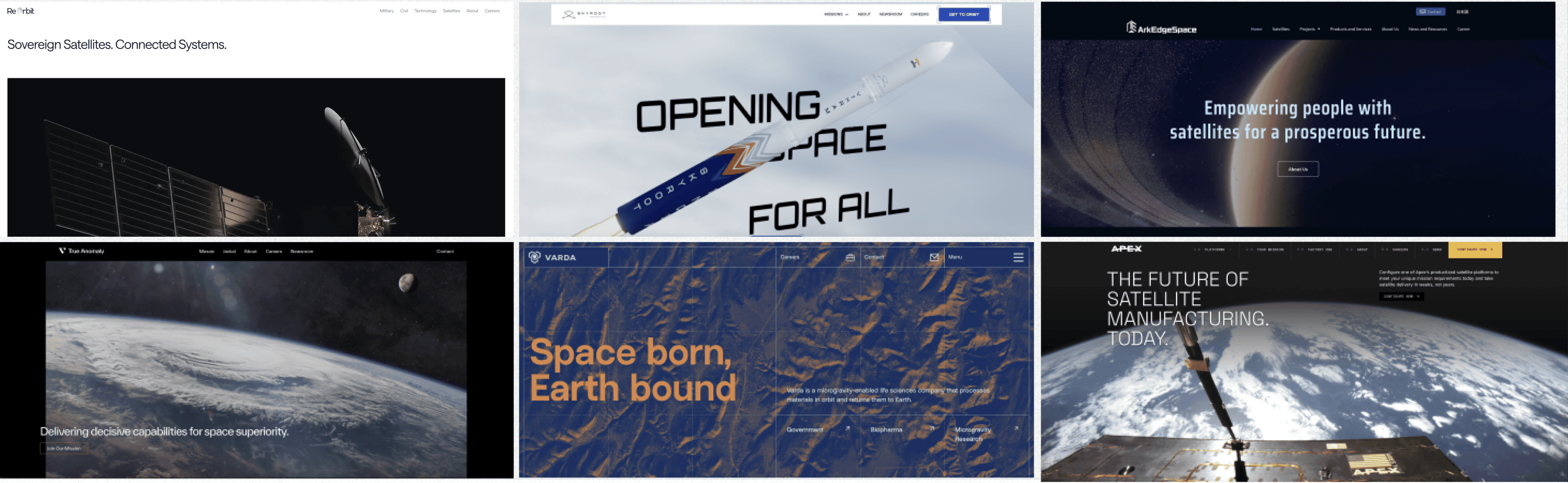 Space and aerospace companies often frame their technology as sovereign infrastructure built to survive extreme environments. Their visuals frequently emphasize isolation, orbital environments, and the physics of space systems.