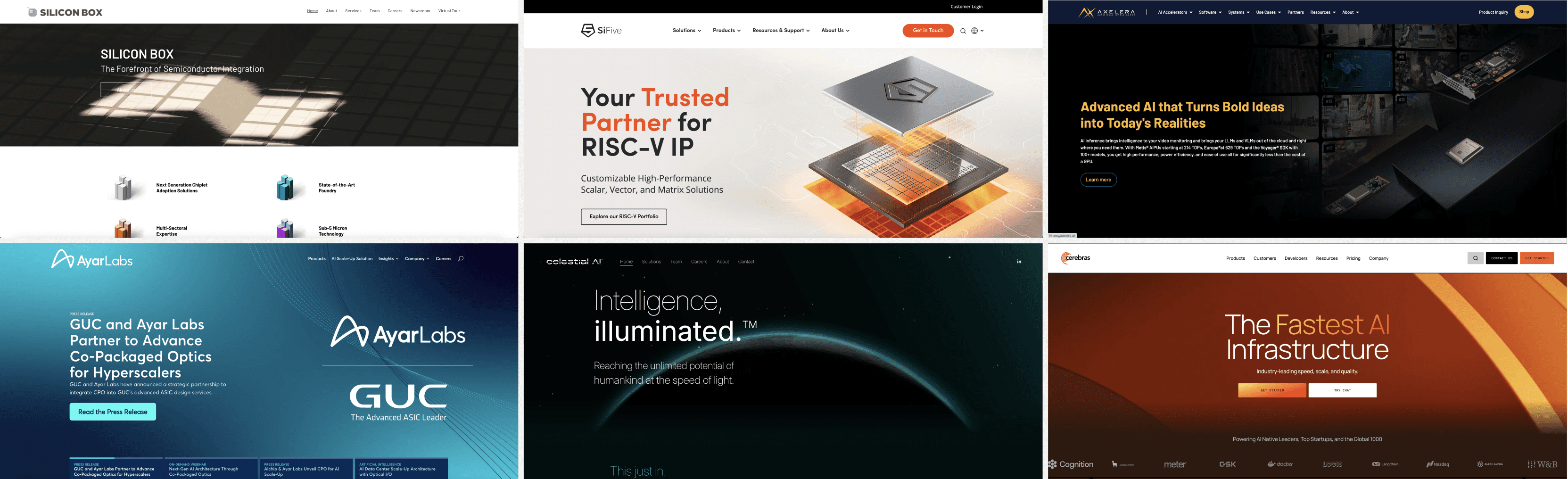 AI infrastructure and semiconductor companies typically highlight performance under strict constraints such as power consumption, manufacturing complexity, and scalability. Their visuals frequently include chip diagrams, system layers, and technical architecture.
