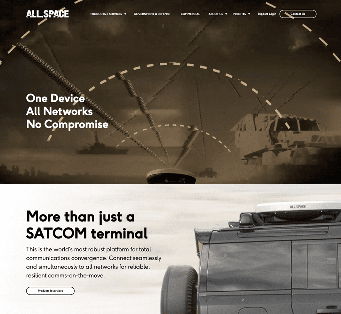 Defense and security companies tend to focus on control, protection, and mission dominance in hostile environments. Visually, these sites often use darker scenes, operational environments, and high-contrast imagery.