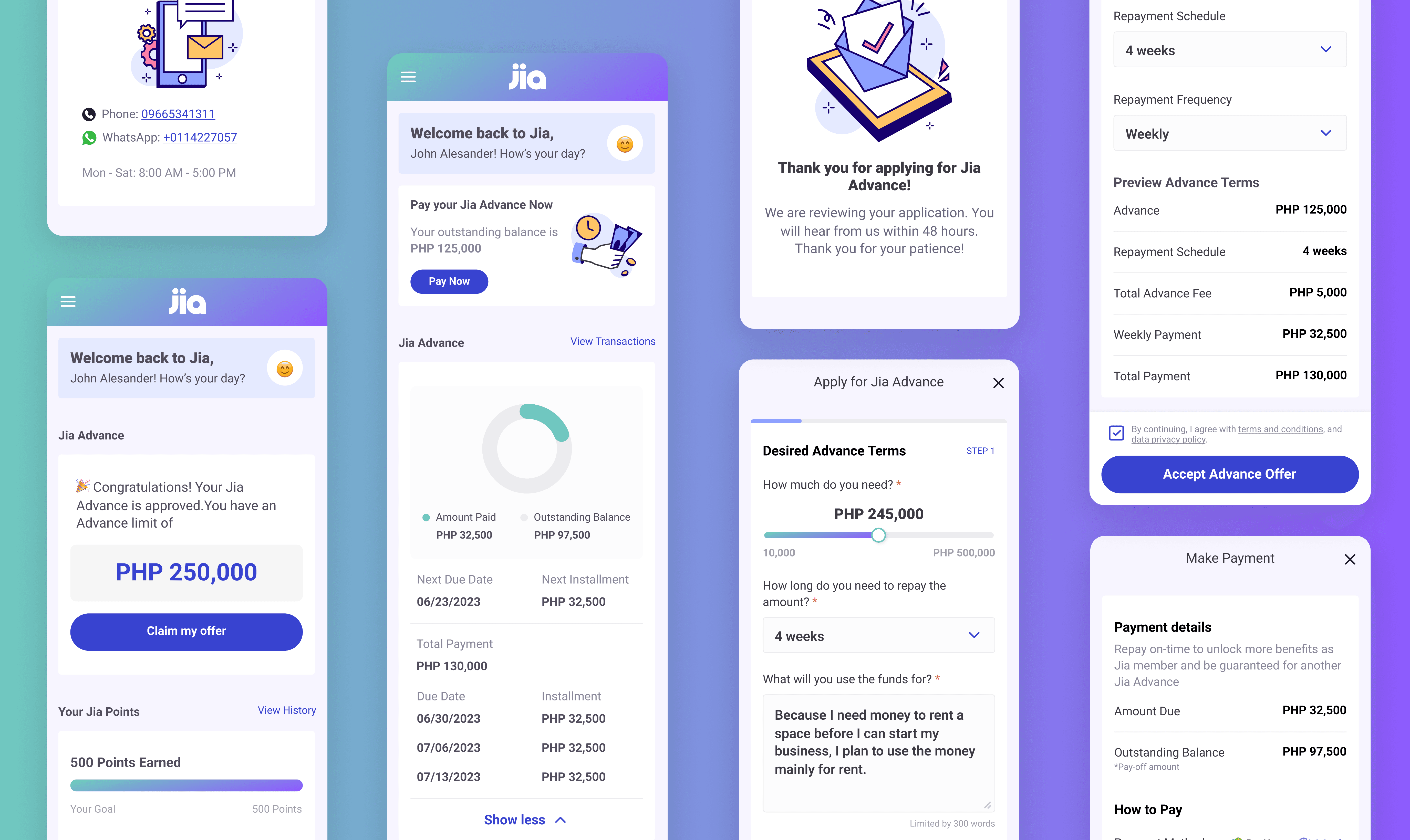 Jia’s users are small business owners between 35 and 45 years old, balancing business operations with family responsibilities. These businesses are not just income generators but crucial to their families' livelihoods. Users often need quick access to funds for inventory and cash flow, but their familiarity with advanced technology, such as blockchain, is limited. Our challenge was to design an intuitive app that makes complex financial solutions accessible.